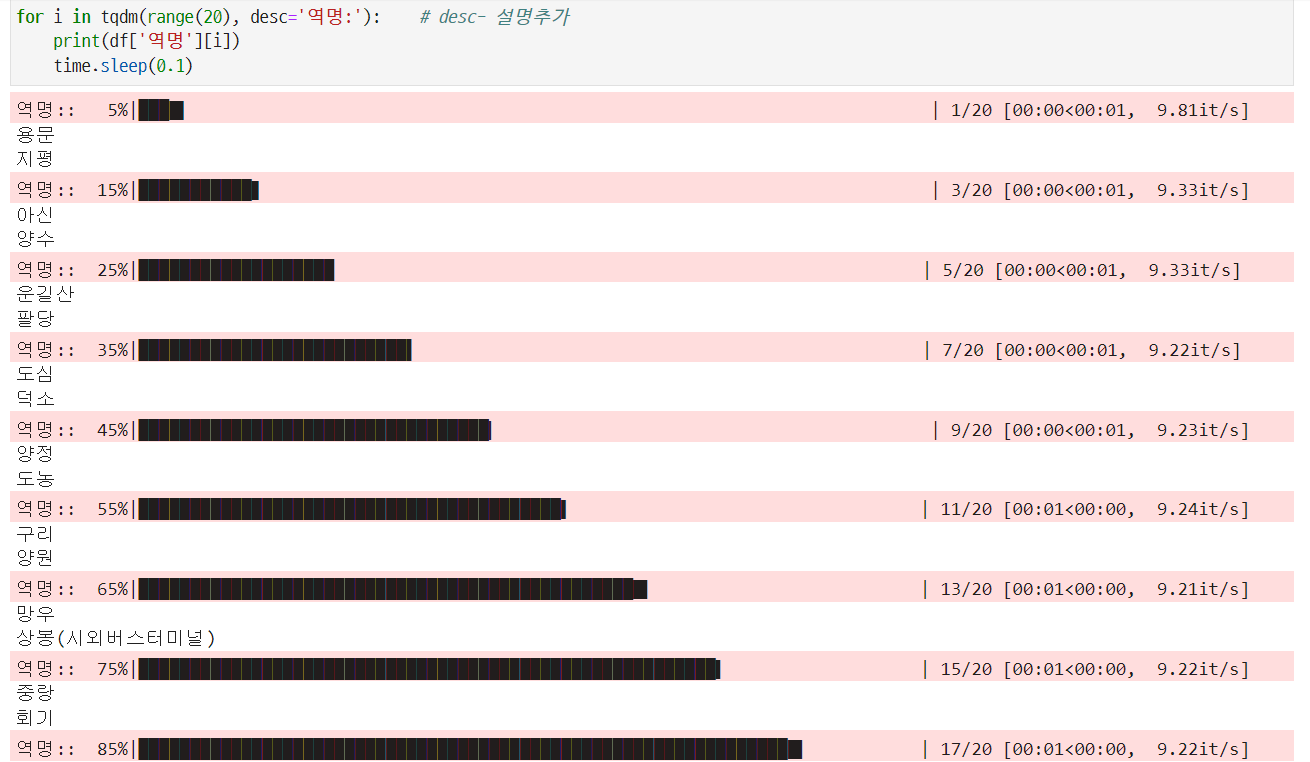 - range 등 tqdm()으로 요소들을 감싸서 사용가능
